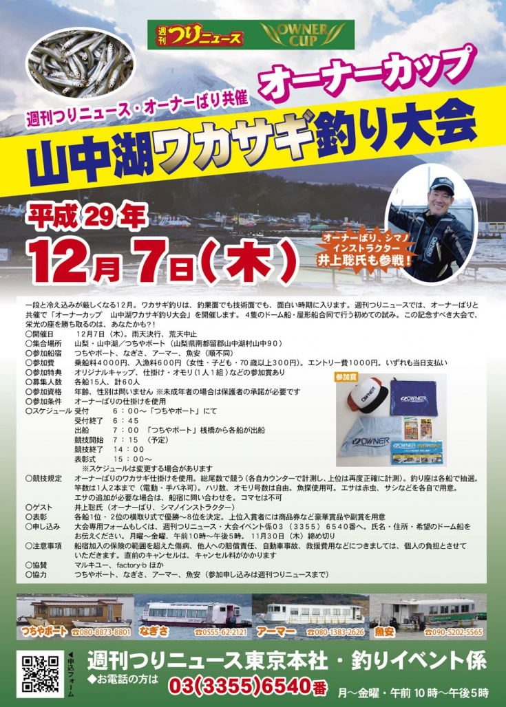 | 競技規定 | ・オーナーばりのワカサギ仕掛けを使用。 ・総尾数で競う(各自カウンターで計測し、上位は再度正確に検量)。 ・釣り座は各船で抽選。 ・竿数は1人2本まで(電動・手バネ可)。 ・ハリ数、オモリ号数は自由。 ・魚探使用可。 ・エサは赤虫、サシなどを各自で用意。 ・エサの追加が必要な場合は、船宿に問い合わせを。 ・コマセは不可 |