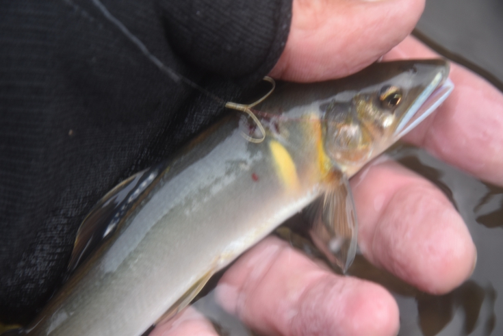 今日は、調子よさそうです。2匹目も2分も経過しないうちに、瀬尻で目印が一気に下流に突き刺さる良いファイトを見せてくれます。
