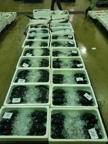 ちょうど、着いた時に魚市場内で水揚げされた魚の競りの準備がされており、場内を除いてみると大型ブリやヒラマサをはじめ、今回私が狙うグレも競りに出ておりました。