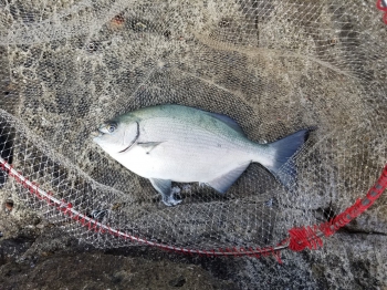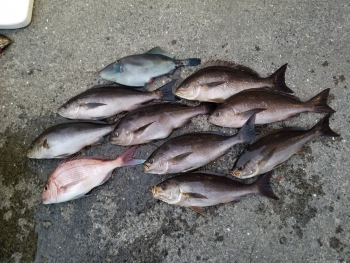 その後もサイズUPを図って狙いますが、釣れてくるのは同サイズのグレとイサギ、終了間際に35cm程のグレが1枚釣れました。
