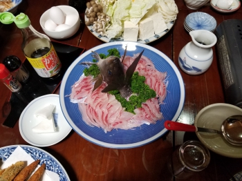 あいにく、グレは1匹も釣れませんでした。そして、この日の夕食は、釣ったイサギの刺身、前日に釣れたヒラスズキのフライ、すき焼きと、豪勢な食事となりました。