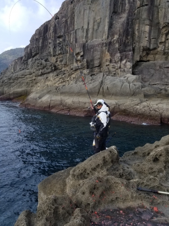 ここの釣り場は初めてにしても、過去何度も五島にはグレ釣りに来ており、正直、こんなにも長い時間アタリがないことはなかったので、「今回の釣行は厳しいなぁ」とボヤいていると、沖の潮筋へ流し込んでいたラインが走りました。