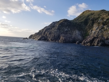 北西風が吹きつける大波の中、船酔いに苦しみながら約4時間の航程を経て、昨年夜釣りで数が釣れた女島の「二重鼻の奥」へ小林氏と登礁。