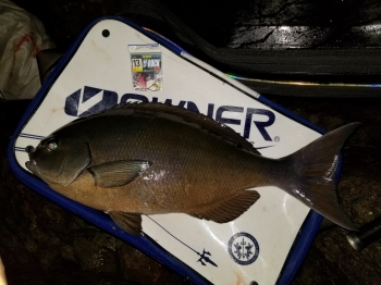 正直、この一尾で満足であったが夜が明けるまで若干時間もあったので、再び磯際を狙うと直ぐにアタリが。これも50cm後半の尾長グレ。