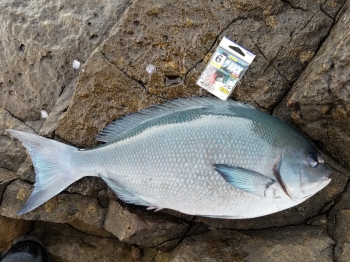 久しぶりに引っ手繰るアタリに喜びを感じながら、足元から張り出す沈み瀬をかわし浮かしてきたのは、50cmを越える良型の尾長グレ。