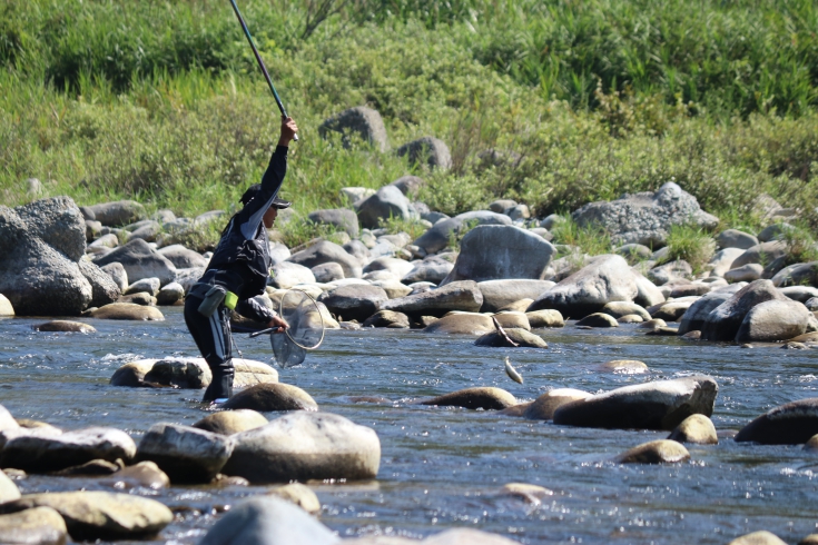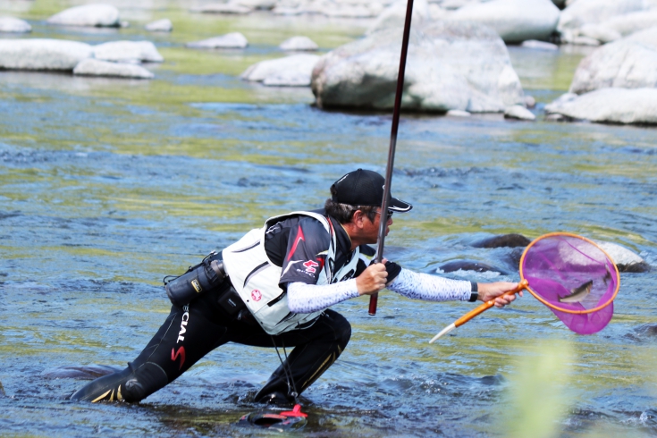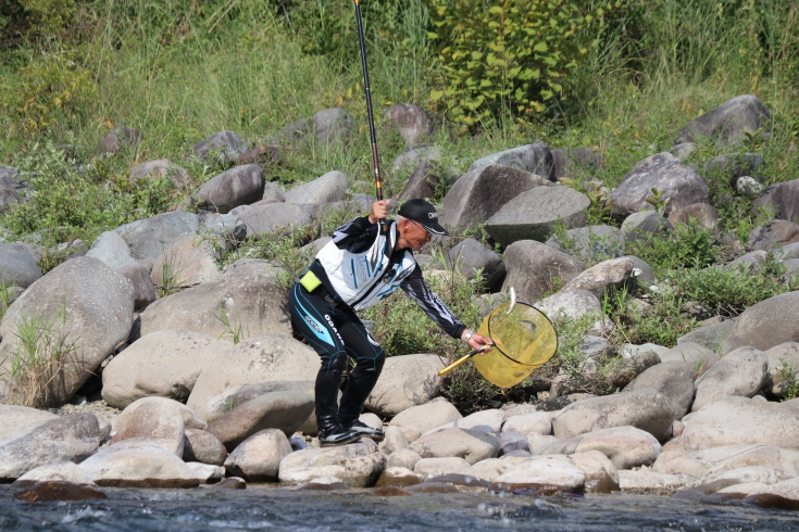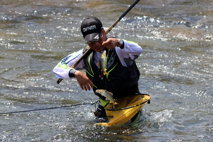 大アユで有名な益田川ですが、今年は数がさほど出ないものの例年になく型が揃っており、中には20cm後半の大型も混じったため、この特異な状況が身切れによるバラシや親子ドンブリなどのトラブルも散見し、選手らを苦しめました。