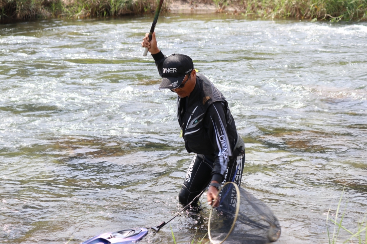 大原選手対辻選手は、辻選手のエリアの一番の狙いどころに一般の釣り人が入っていたため苦戦を強いられ、大原選手はその間に着実に釣果を重ねていきました。後半エリアが変わった辻選手は猛追したものの、その差を埋めることはできず、大原選手12匹、辻選手9匹で大原選手が勝利。