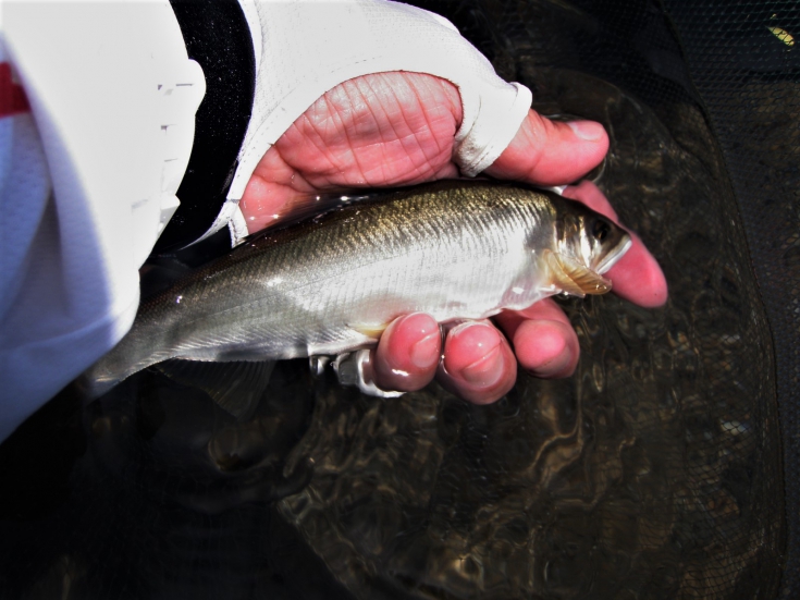 しかし単発で上流に移動しながら釣って何とか11匹が引船に入りました。Mさんに声を掛けると”8匹”との事。