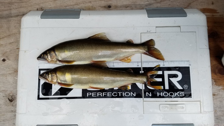 鈎、一角8号に変更してオモリ2.0号、急瀬へ流し即一発目25センチクラス、同サイズが4連発。
