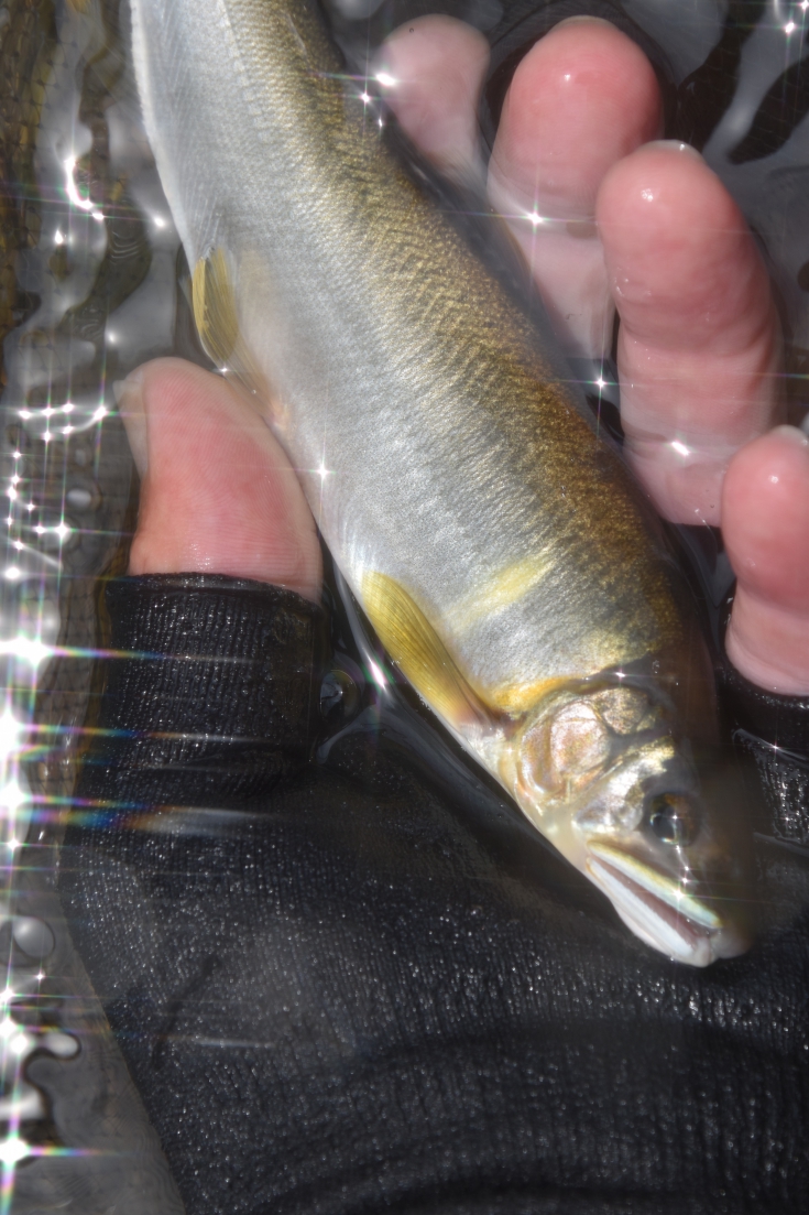 ほっとしながらの慎重にタモに収めたのは、17cmサイズの追星が2つあるやる気人工海産の若アユです。