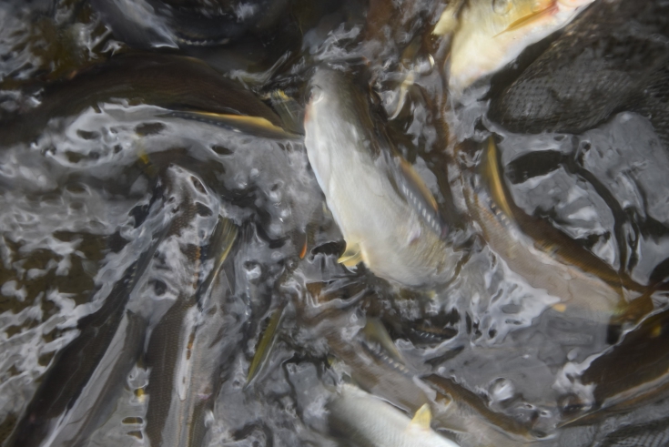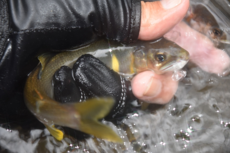 早速、3本イカリ(颯・HAYATE)6.5号で瀬肩のポイントから送り込むと、秒殺!「ギラリ!」と水中で輝きを放ち、2匹がもつれるように対岸筋を下ります。「ラッキー!」と、ばかり慎重に水面を割り、タモに飛び込んできたのは、バッチリ背掛かりの真っ黄色な若アユ。ようやく「揖保川の上流部の復活!」です。