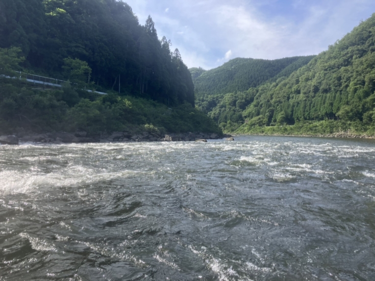 江ノ川はやや濁川系なので水深が分かりにくいため、慎重に瀬を下りながら釣ります。