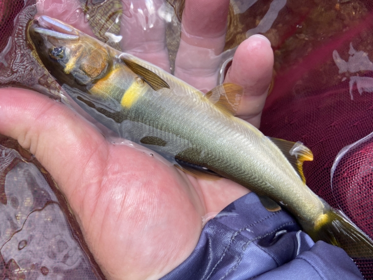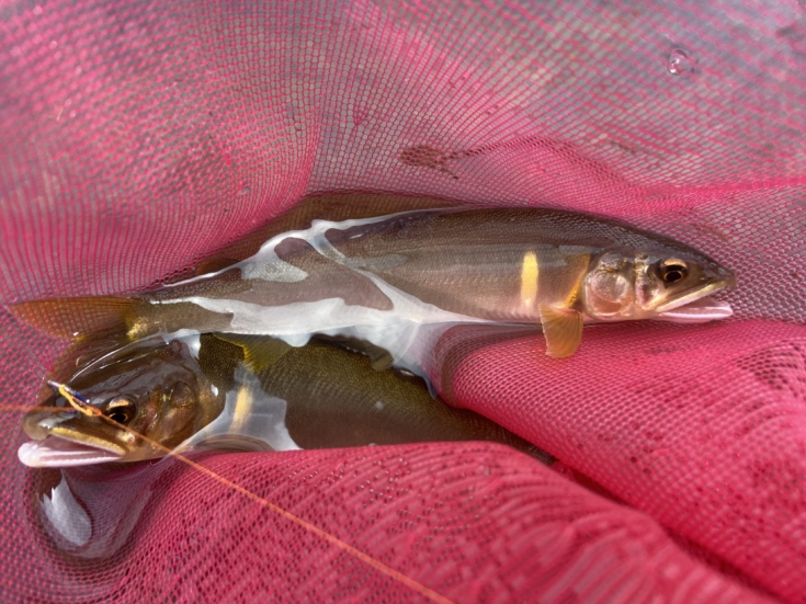 反応が悪くなったところで中山さんと合流すると、型が小さく、あまり状況が良くないとのことなので、昼食のタイミングで型を狙うため大きく下流域へ移動。