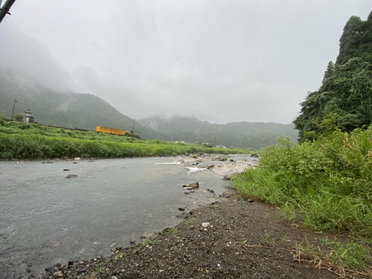 すると30分ほどで止みそうな感じだったので、上流の橋まで歩いて雨宿りして、それから釣り下がろうとさらに数百m移動しましたが…雨脚は強さを増し、雨宿りしている間にも雨雲はどんどん増え、夕方まで雷雲の切れ目がない予報となりました。