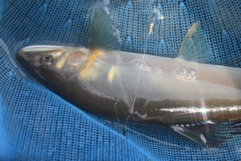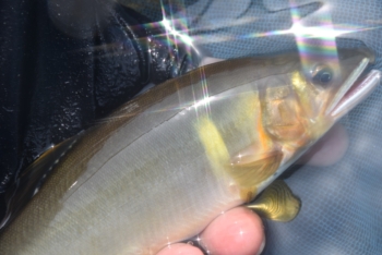 すると瀬肩の対岸の岩盤で「ゴッ・ゴン!」と衝撃のあるアタリ。ご機嫌です。しっかりと引き寄せてタモですくったアユは、今日イチのどこに出しても恥ずかしくない見事なアユ。迫力のあるボディーにも感激してしまいました。