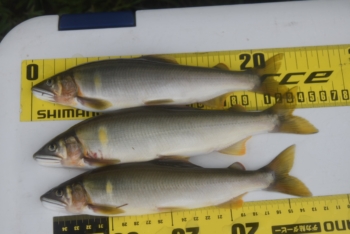 その後、やはりポツリ・ポツリと雨が降り出します。20cmサイズを瀬肩で2匹取り込んだところで、予想通りの増水と本降りの雨に追われ早々の納竿とすることにしました。