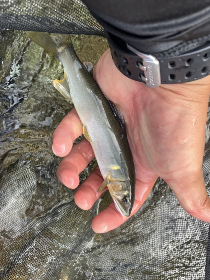 ちょうど駐車場正面の右岸の流れが空いていたので入るとものの数分で18cmぐらいの鮎が掛かります。