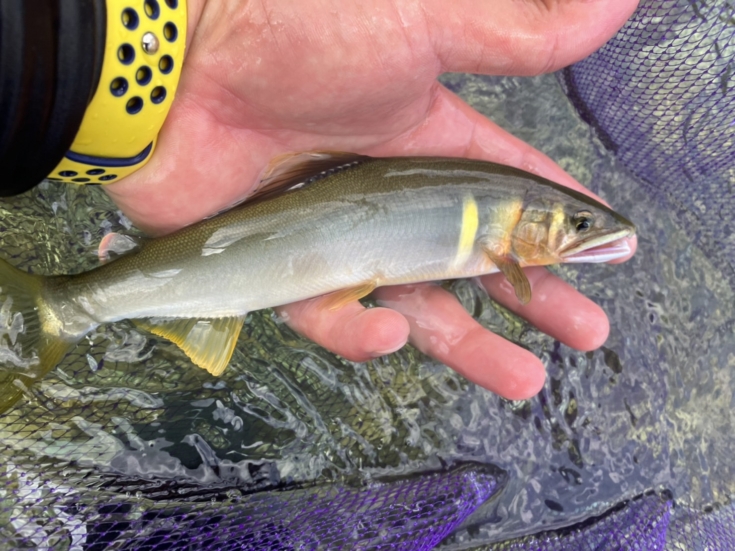 探しながら瀬の脇から流心にかけてテンポ良く探っているとガガっと反応があり、時折掛かりますが20センチ弱のこの時期としては小さな鮎が掛かります。