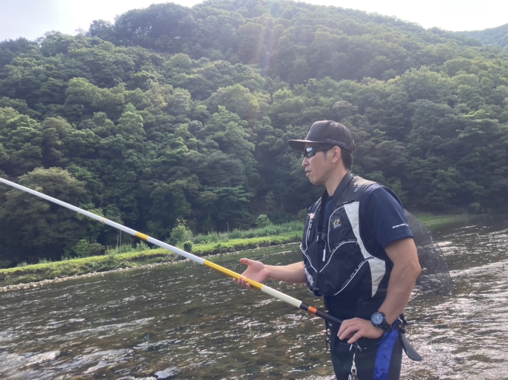 おとり鮎を空中で振り回しながら何度も瀬の中を走り回るのは正しく天然海産鮎。