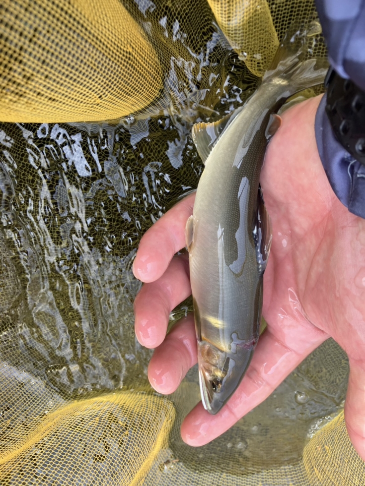 セオリー通り、瀬肩一つずつ丁寧に泡立ちや縦波、石の色の変化しているところにおとりを通していくといきなり目印がぶっ飛びます。