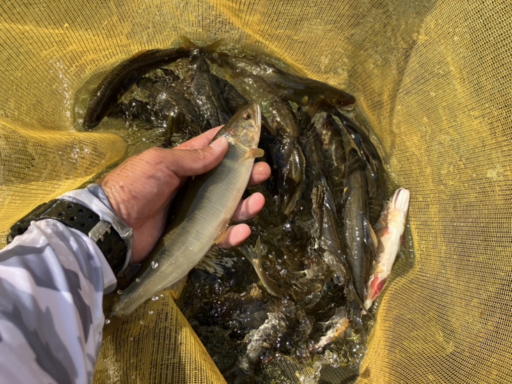 石色はまずまず磨かれていて、群鮎もチラホラと見えてましたのでまずはチャラ瀬を泳がせでオトリを取ります。