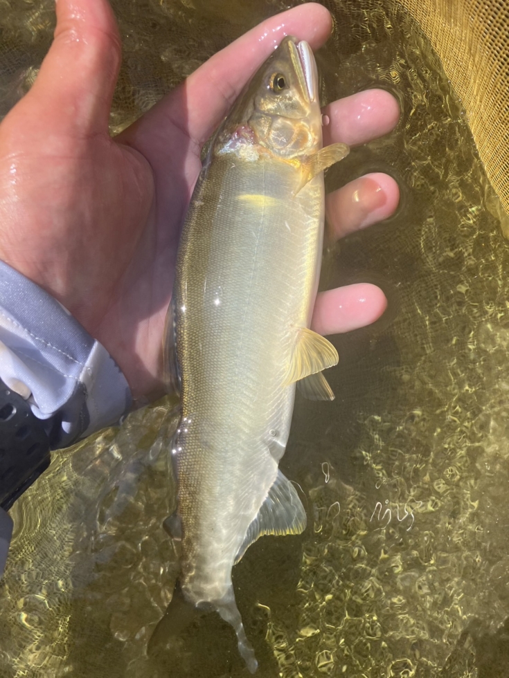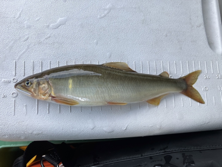 瀬の中に付け引いたり止め泳がせたりとしても反応はなく、瀬の中は居ないのかな?と思いながらも今度は下から上飛ばしでその中にフラフラ入れていくと、ギランと激しい当たりをみせて掛かったのは一際大きな25センチ級。