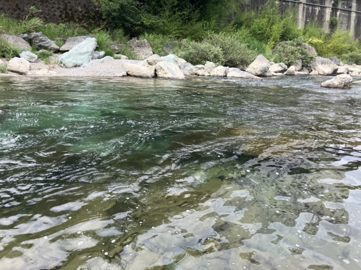 本当に鮎は居るのか?と疑いながらもよく見ながら歩いていると所々に白〜薄緑に見える箇所がある事に気付きます。