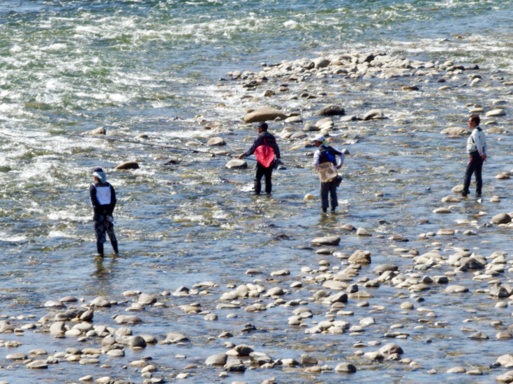 県内と県外から参加者が集まり総勢8名の小さな講習会ですが、和やかな雰囲気で皆さん楽しんでもらえたようです。午後からは、参加者の皆さんと温泉橋下流で竿を出し短時間ながら21cmの太った鮎が荒瀬で竿を絞り込んでくれました。鈎はキメラ7.5号でバッチリでした。鮎のキズも小さく講習会参加者の皆さんも気に入ってくれたようです。