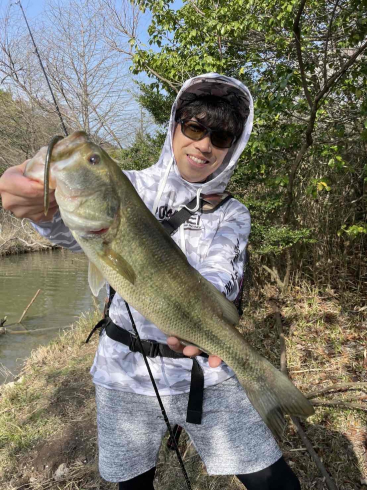 まさかの1投目、根掛かりが頻発する起伏が多いハードボトムを丁寧に探っているとズドン!!