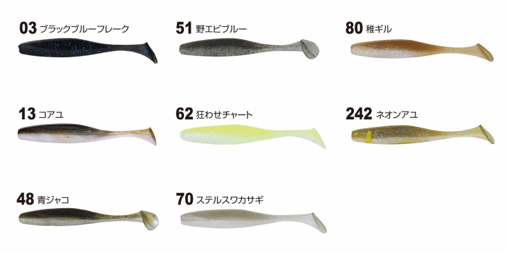 他サイズとは異なるマテリアルや、エアーホールを無くす等、細部にわたり調整を繰り返し、小型シャッドテールだからこそのベストなアクションを突き詰めたワームです。