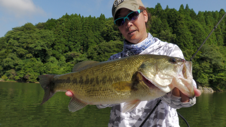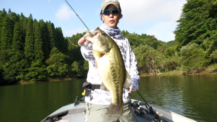 夏のバスがどんな状態で、なにを好むかというのを手がかりに、沖の深場や岸ギリギリのシェード、そしてカバーといった多彩なポイントを、トップウォータープラグや直リグ、ミドストで探り、いずれのポイントでもバスをキャッチしていく。