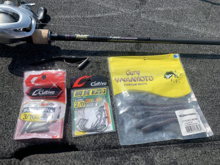 ピックルワームと瞬貫フック2/0、ジカリグスピン3/16gの組み合わせで