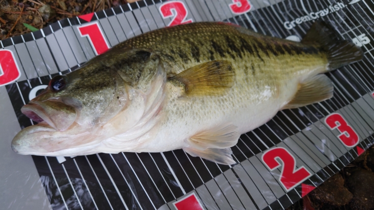 かなり引きが強くしばらく格闘した後に釣れたのは、体高バキバキの44cmのバス!