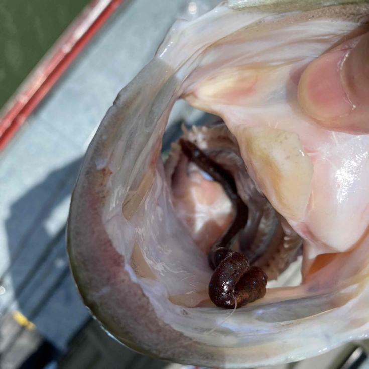 最後に午前中釣れた周辺のシェード(影)+岩盤エリアをネコリグで探っていると、ようやくバイト!