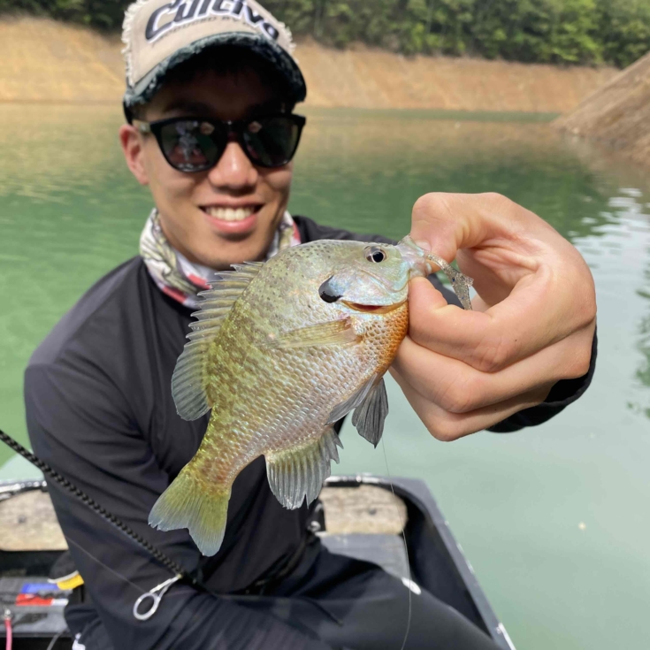 数釣りの実績があるワンド奥の倒木エリアで奥野が癒しのゲスト、ブルーギルと戯れてそのままタイムアップとなりました。