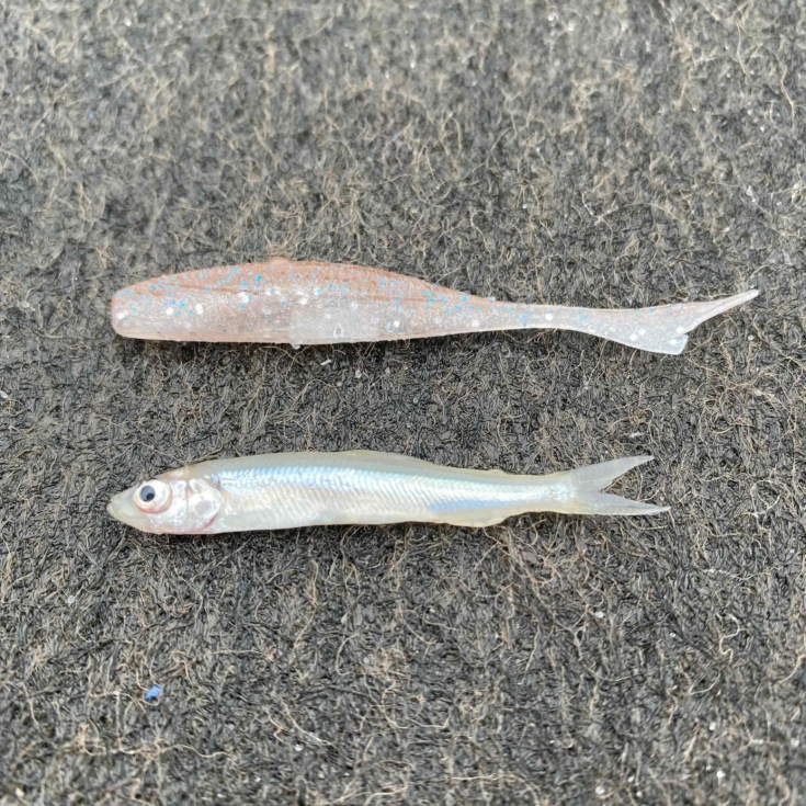 ファイト中、バスが何かを吐き出したので掬ってみると、青野ダムのメインベイト、ワカサギでした。ジャスターフィッシュ2.5と比べてみると瓜二つ。