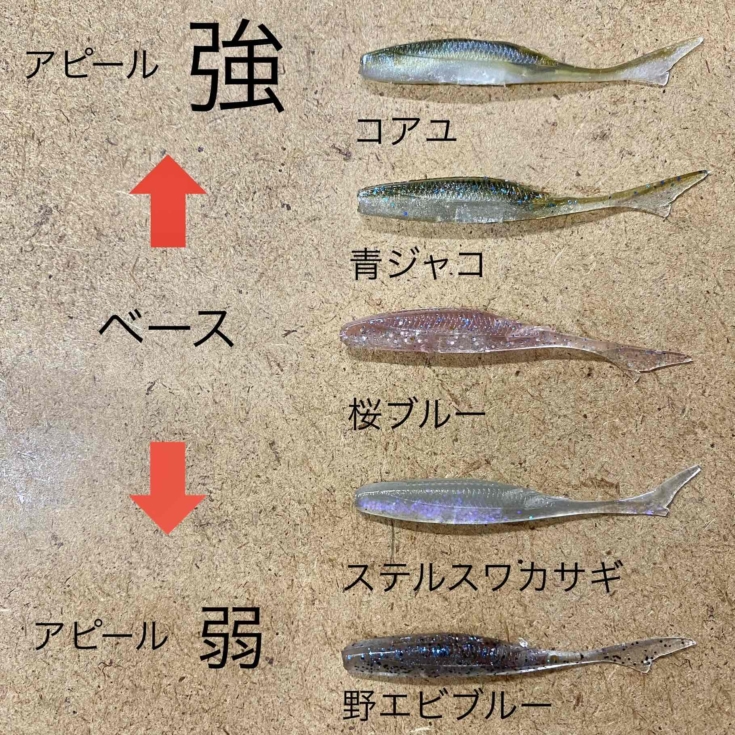 【弱アピール】→野エビブルー・ステルスワカサギ(フラッシング系にすれていると感じた場合に使用しています)