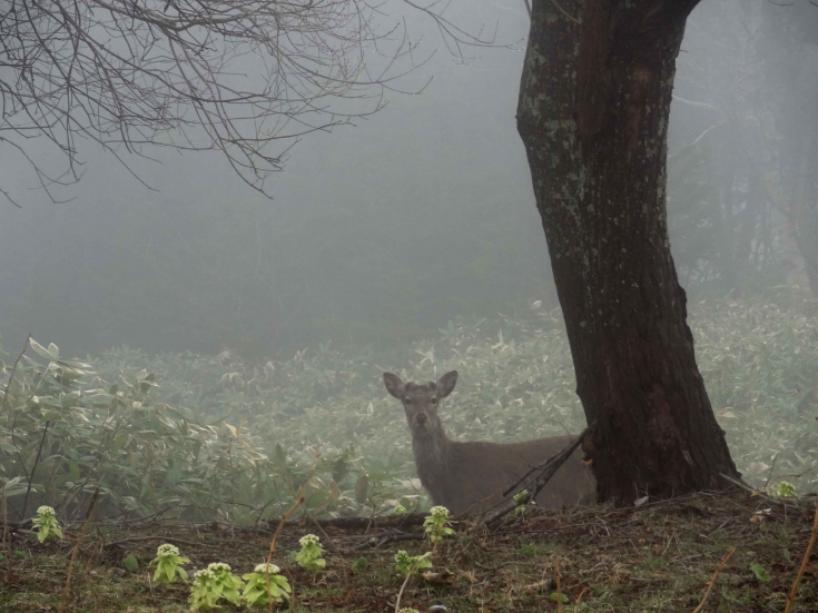 朝靄に包まれた河畔林の奥に佇むエゾシカ。北海道の自然はジブリの森のようだ。