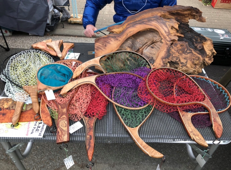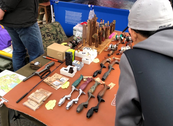僕はいくつかに分かれたエリアのFISHING AREAでCatch and eat(キャッチアンドイート)の釣り堀ブースを中心に出展したハンドクラフトのオフセットグリップやカスタムクラフトのトラウトネット、漆塗り工房やガラス金属加工工房などが主催するブランドの中のひとつとして参加させていただいた。