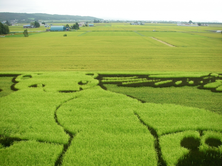 009・すくすくと育つ北国の稲(写真は鷹栖町の田んぼアート)。