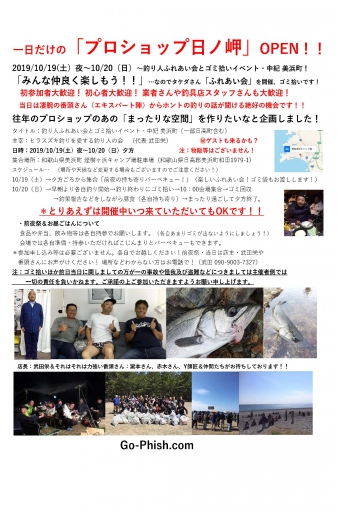 という訳で僕もこの秋釣具店さんでのイベントに加えてフィールドでのイベントも企画しました!名付けて「一日だけのプロショップ日ノ岬オープン!」と題した紀伊半島でのロックショアアングラーを中心とした釣り人同士のふれあい会とゴミ拾いイベント。前夜祭では深夜まで釣り人同士の交流会をし、翌朝は釣りのあと少しの時間フィールドのゴミ拾い。午後はみんなでランチをし様々な釣りにまつわる話をして過ごすというごくごくまったりなイベント。実はこれ、その昔プロショップさんなんかが主催してた小さな大会や集まり。2019/10/19(土)~20(日)(悪天時は中止?)和歌山県日ノ岬へ集まれる皆さんは是非どうぞ! 得か損かは参加してみてからお決めください!(笑) 是非いろいろな皆さんと交流して欲しいと思います。