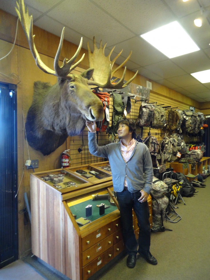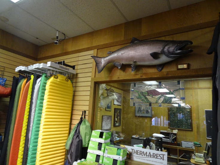 013・郊外の釣り具店、というより、何でもありのアウトドアショップというお店。巨大なキングサーモンの剥製に度肝を抜かれる。