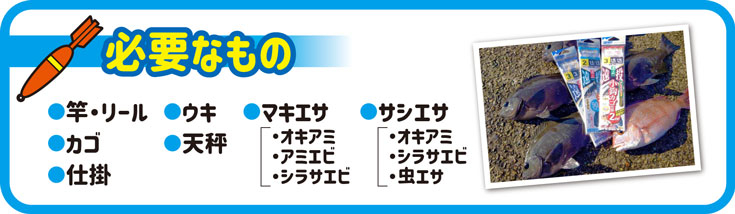 オキアミ、刺しアミ、活きエビ、虫エサ等が一般的。