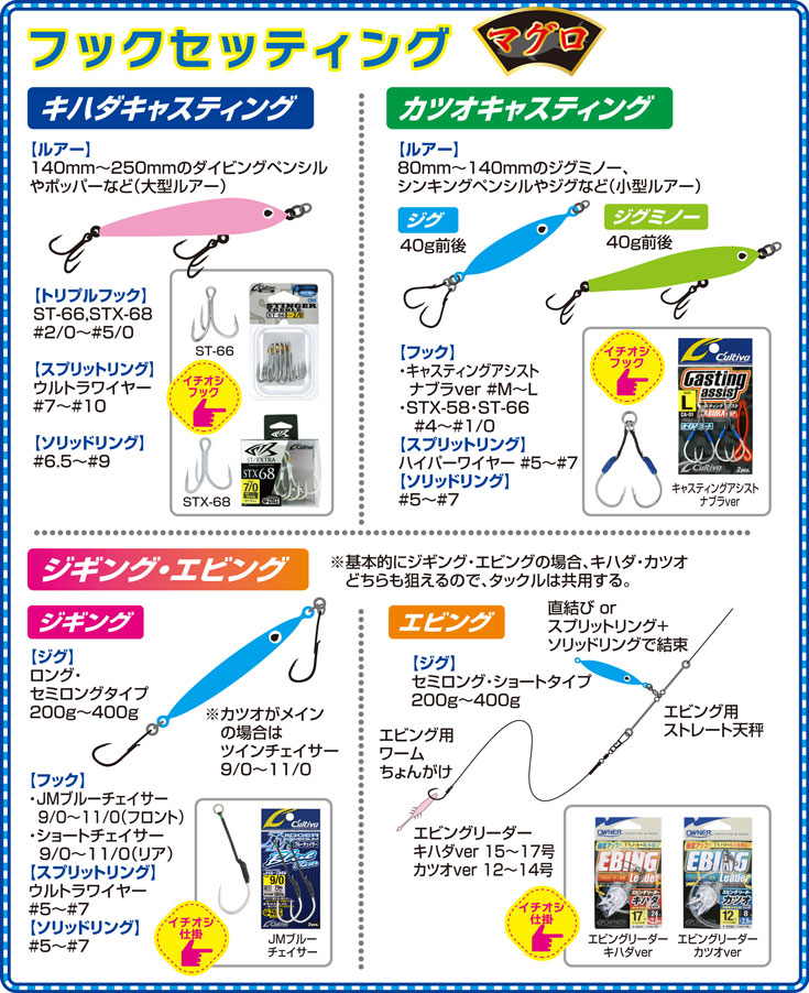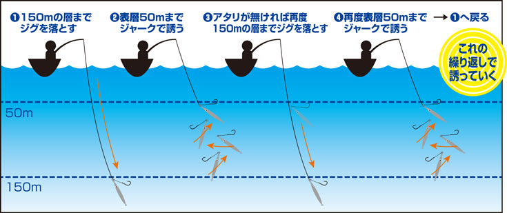 ジギングの場合は水深50m~150mラインの層を回遊していることが多く、魚がいるであろう層を狙っていく釣り方です。基本スタイルは中層でのジギングとなり、長時間のジャーキングでも疲れにくいタックルセッティングがオススメです。