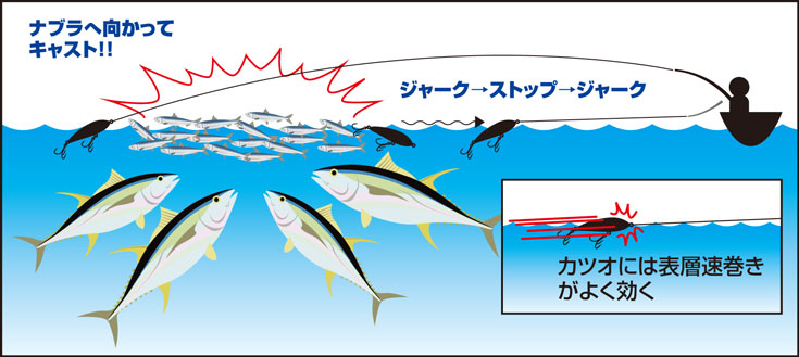 キャスティングの場合はメインはナブラ撃ちです。魚が海面付近でエサを捕食し湧いている所にルアーを投げ込みます。着水後、ジャークやポッピングで魚を誘い出します。また近年ではナブラが無い状況でも誘い出す釣り方も確立されています。