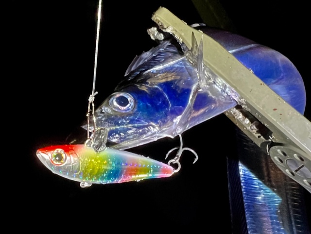 テンヤやウキ釣りでも多く見られるドジョウやキビナゴと言った「エサだけが無残にかじられる現象」。これルアーも同じで(タチウオが寄ってきてくれるルアーでないといけませんが)特に夜は水面付近まで捕食モードに入ったタチウオはその活性の高低にかかわらずエサおぼしき物には近づいて触ってきます。後はどうフッキングさせられるか?まだまだ課題は山積みですが、フッキングしやすい独特の形状も相まって高活性時にはエサ釣りをもしのぐルアーの釣果もあります。もちろん使うのは最新のPEラインのタックルですからその僅かなバイトも見逃しません!「あっ!..あっ!」…タチウオがルアーに触るたびこんな声が(笑)そこで僕も仲間も必死になるのが「フックの交換・サイズのチューニング」。