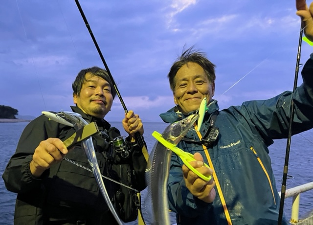 「ひょんなこと?」と言えばですが釣りウマの仲間達との些細な話からまた新しい釣りが生まれました。ハイライトを付けること、フォールを交えた表層付近での釣り、とにかく掛けていく工夫…。正にテンヤとプラグ→エサとルアーのハイブリッド釣法とでもいうべき新たなスタイル。じっくりとやりたい方はエサ釣りで!短時間で楽しみたい方や普段はシーバスや青物、ライトゲームなんかをされるルアーマンの皆さんには是非試していただきたい新たなタチウオのスタイルです!はりの違いも実感できますよー!