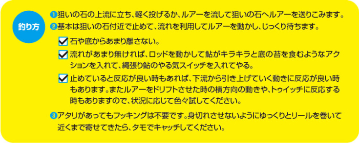 基本は狙いの石付近で止めて、流れを利用してルアーを動かし、じっくり待つ方法です。