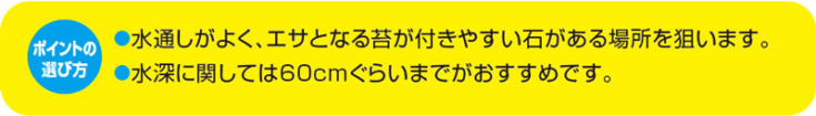 縄張りを持つ鮎がいるのは、水通しがよく、エサとなる苔が付きやすい石がある場所です。