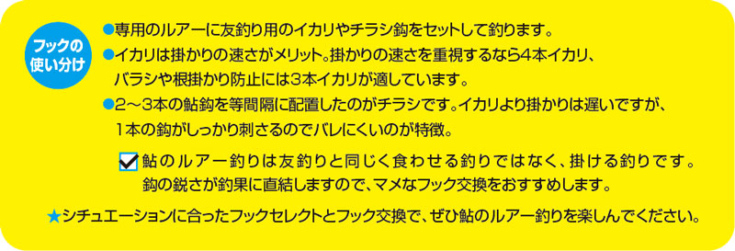 専用のルアーに友釣り用のイカリやチラシ鈎をセットして釣るのですが、友釣り用の鈎には種類が沢山あり過ぎて、友釣り経験者や上級者ならともなく、初心者の方は何を使えばいいかわからないという方がほとんどだと思います。